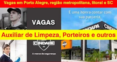 A Cindapa está com 49 oportunidades de emprego abertas em seu site. As vagas são para Porto Alegre, Gravataí, Novo Hamburgo, TORRES e outras cidades. Na capital gaúcha as oportunidades são para: Instalador de sistemas, Vigilante, Porteiros, Zeladores e Auxiliar de Limpeza (confira aqui).