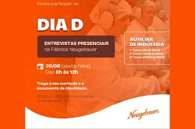 A seletiva está marcada para acontecer no próximo dia 30/08, sexta-feira, na indústria. Os interessados em trabalhar na Neugebauer devem comparecer ao local munidos de seu currículo e carteira de identidade das 8h às 12h. O endereço da fábrica é RS 130, nº 2258, Bairro Medianeira - Arroio do Meio.